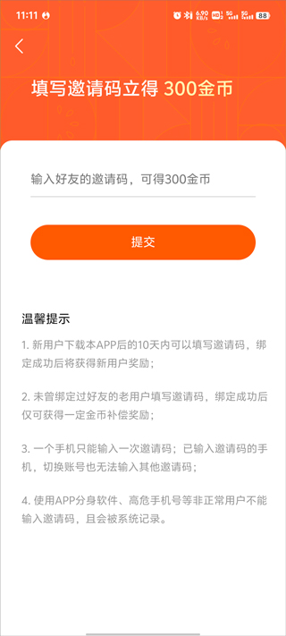 2、最后在输入邀请码即可领取300金币。