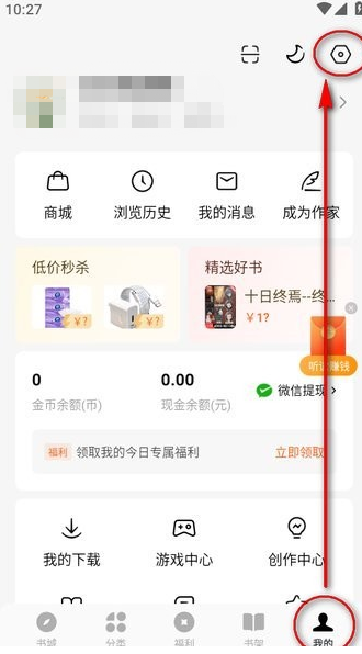 1、打开番茄小说app后,点击右下角“我的”,并选择右上角的设置按钮;