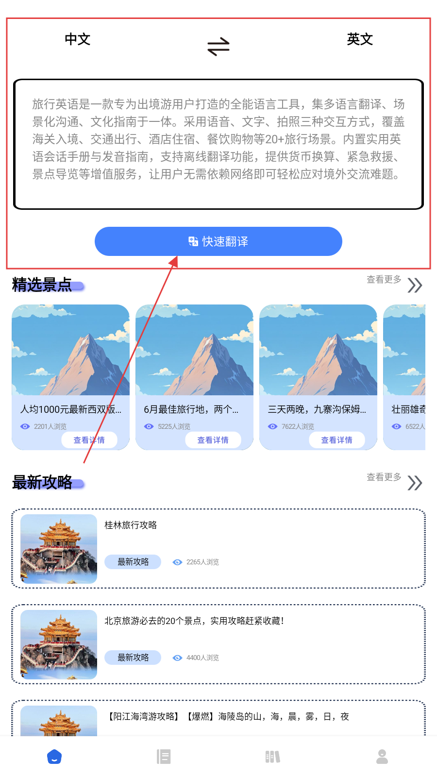 1、出境游如遇语言问题,可以将需要翻译的文字输入,点击【快速翻译】。