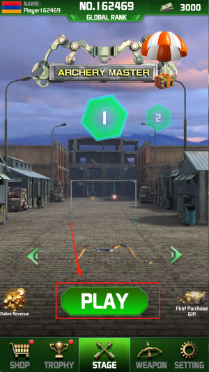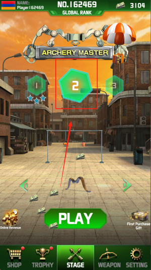 2、提升分数:进入“PLAY”进行射箭比赛,把分数从3000提高到3104以刷新个人纪录。