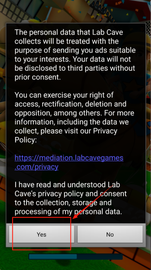 3、同意隐私:阅读Lab Cave隐私政策后,点“Yes”表示同意收集个人数据以接收定向广告。