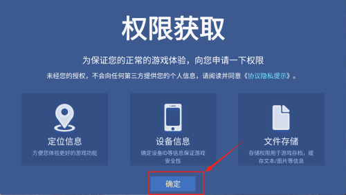3、授权权限:在“权限获取”页面点击“确定”,依次授予“定位信息、设备信息、文件存储”三项权限。