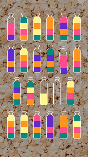 3、要求玩家不断思考,能够点击屏幕来调整相同颜色的水进入瓶子。