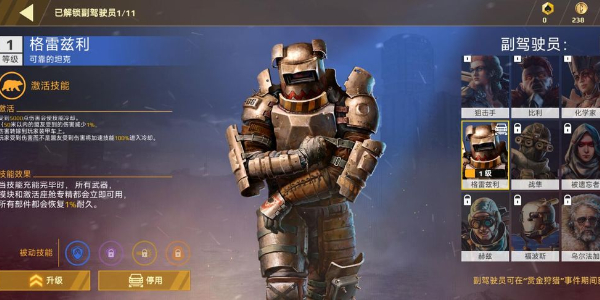 2、点击这个横幅就可以进入副驾驶界面,在副驾驶界面左侧会显示所选取副驾驶的相应技能效果,右侧则列出了游戏中目前所有可用的副驾驶人物列表。