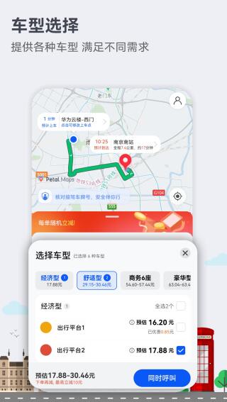 1、Petal出行是一款安全的出租车出行平台,更能满足用户个性化出行需求操作。
