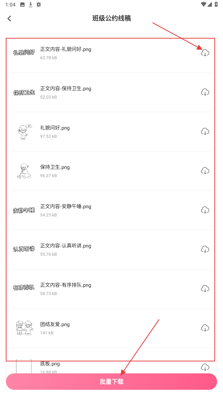 4、进入【班级公约线稿】列表,可单个点云图标或点【批量下载】获取线稿素材。