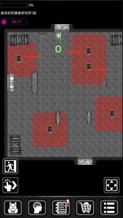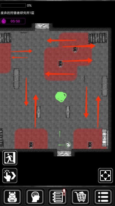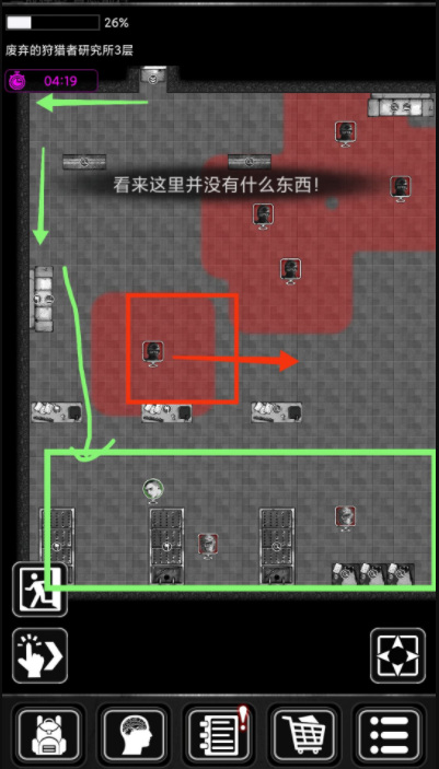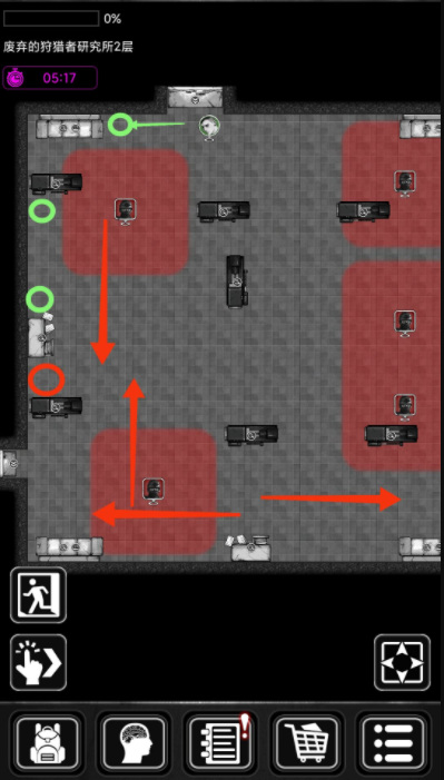 1、守卫移动的方向为红箭头所标。人物移动为绿箭头。守卫采取敌不动,我不动,刚进入图不要着急乱走,先观察,步伐一步一步,每走一步观察守卫移动规律,不要一次走一大截。刚进门如图位置,不知道守卫的移动方向,因此先向左方空缺大的位置移动一小步以作观察。发现两名守卫均向前移动,可放心前行,因为守卫走向大多是直线来回走向,偶尔会在一周期行动后有轨迹变化。
