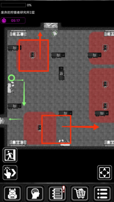1、绿圈位置守卫不能及,一般你走一步守卫走一步,但若你走了,守卫不动,你无地方可以移动,就用静待一分钟。躲在最后一个绿圈位置即可,等待守卫移至门附近,红圈位置看似安全,实则坑了我一次。