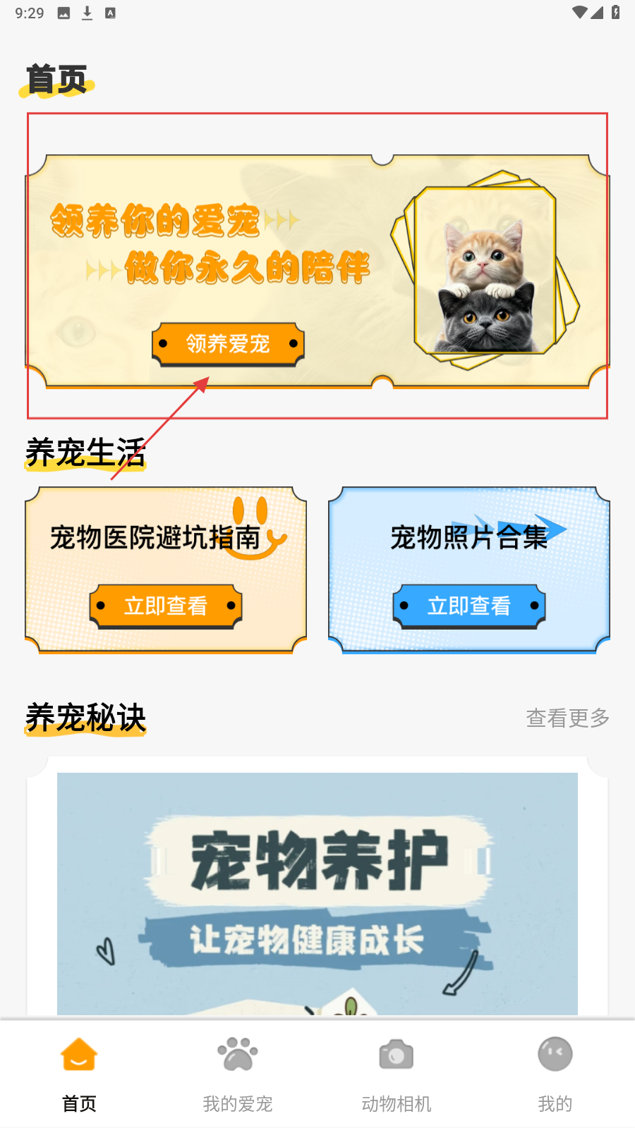 1、打开应用,在【首页】点击【领养爱宠】按钮。