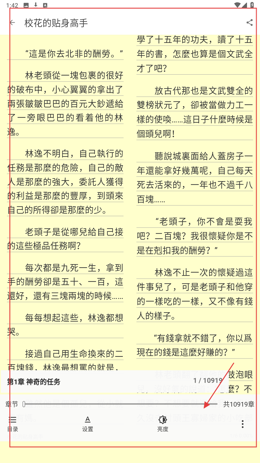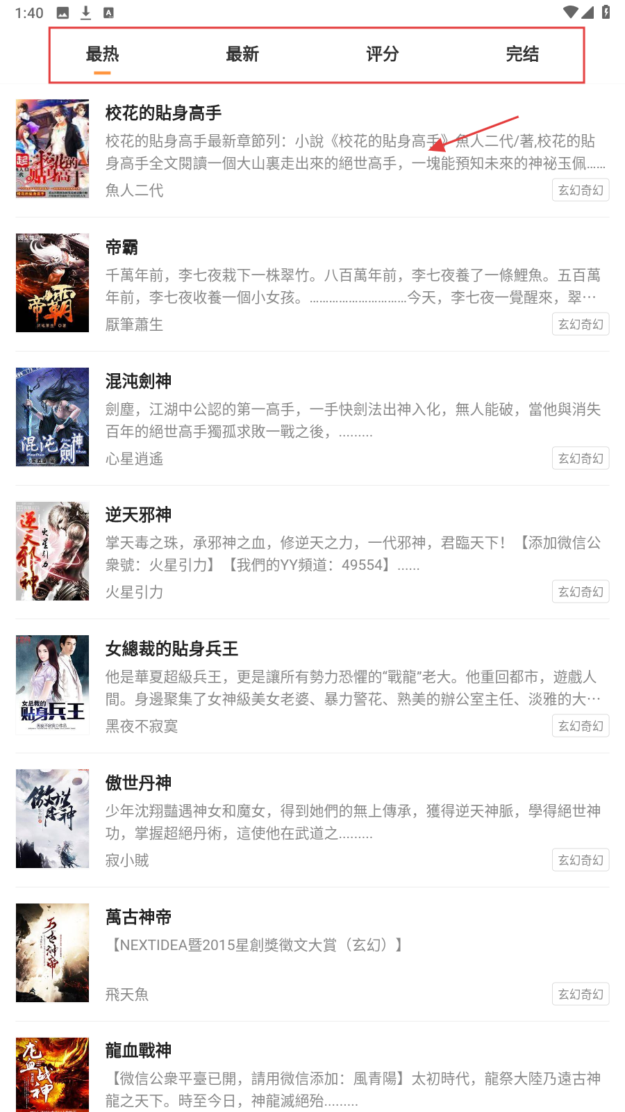 2、在【玄幻奇幻】分类,用【最热】等排序,筛选想看的小说,如《校花的贴身高手》。