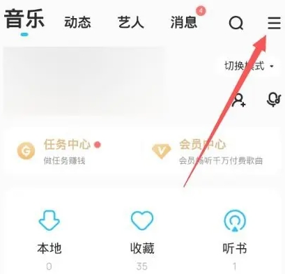 1、点击打开酷狗音乐app,然后点击页面左上角的三横图标。