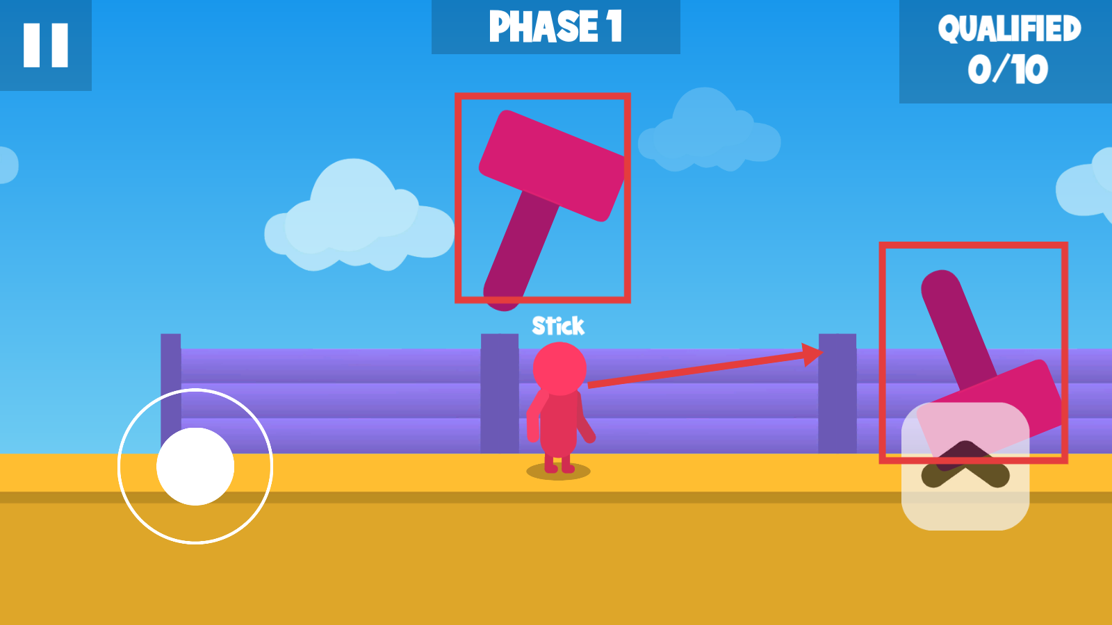 3、面对【粉色巨锤】陷阱,利用左侧摇杆及时移动角色,躲避砸落攻击,保留参赛权。