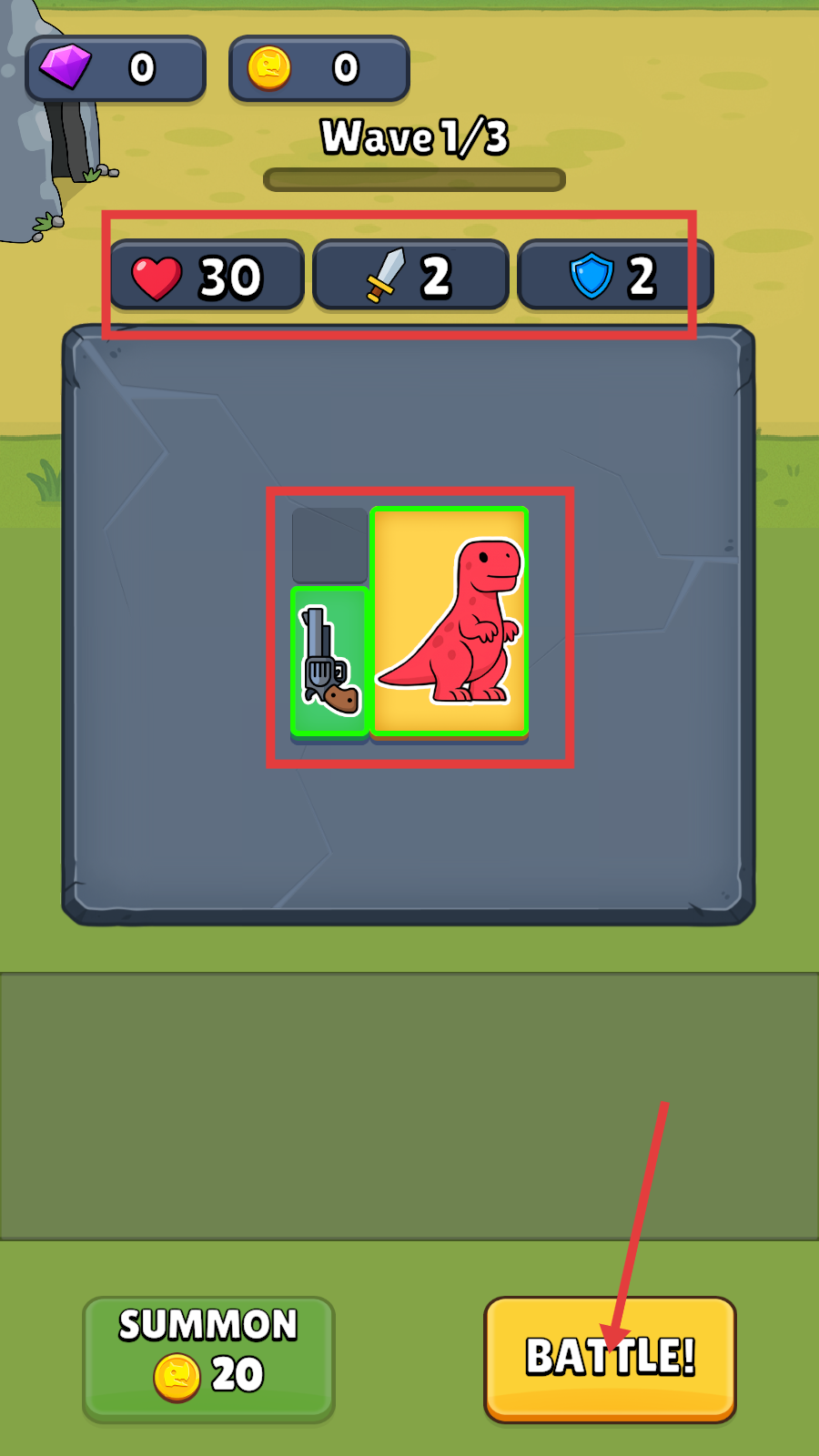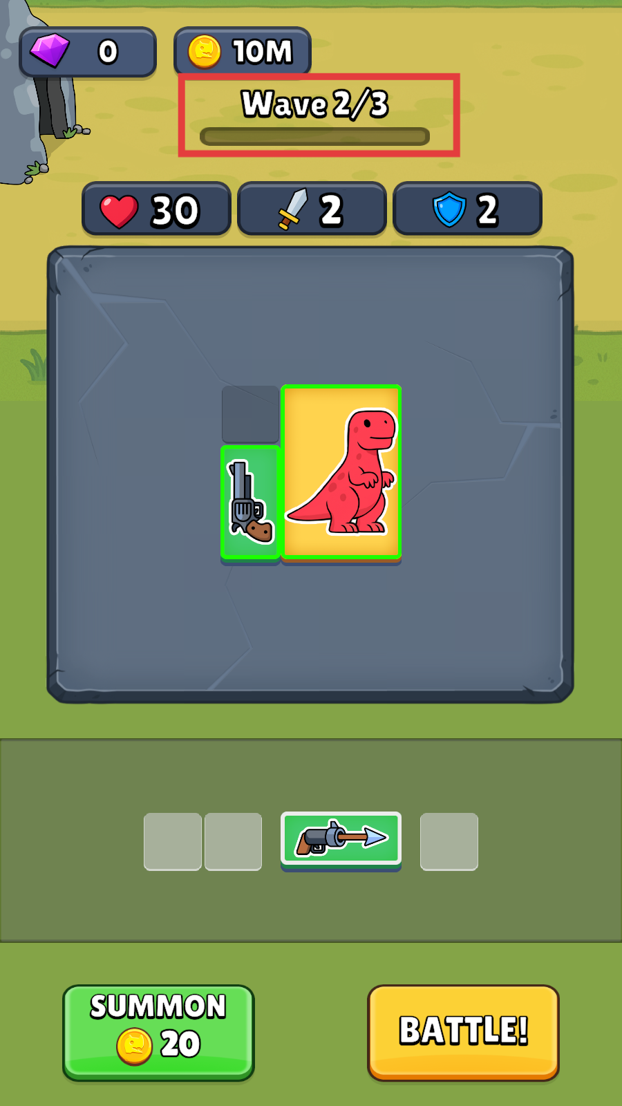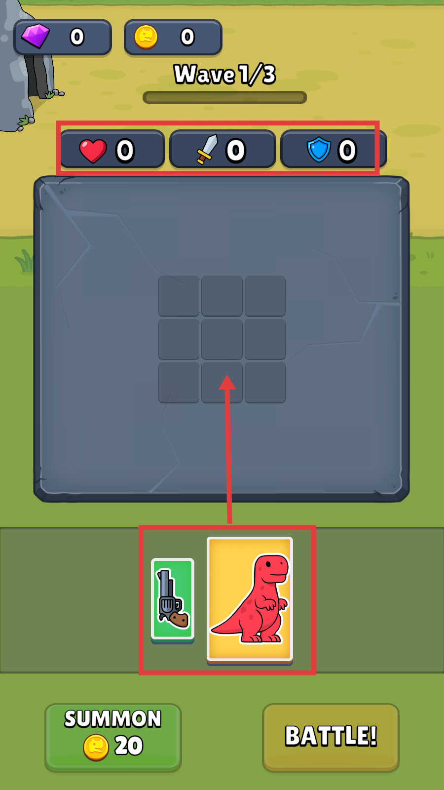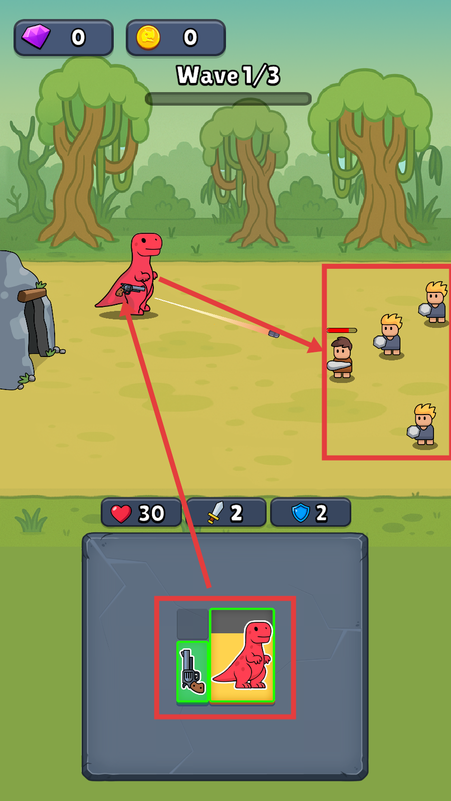 1、战斗准备阶段,将下方【恐龙】【枪械】卡牌拖入上方网格空位,为【Wave1/3】战斗布局。