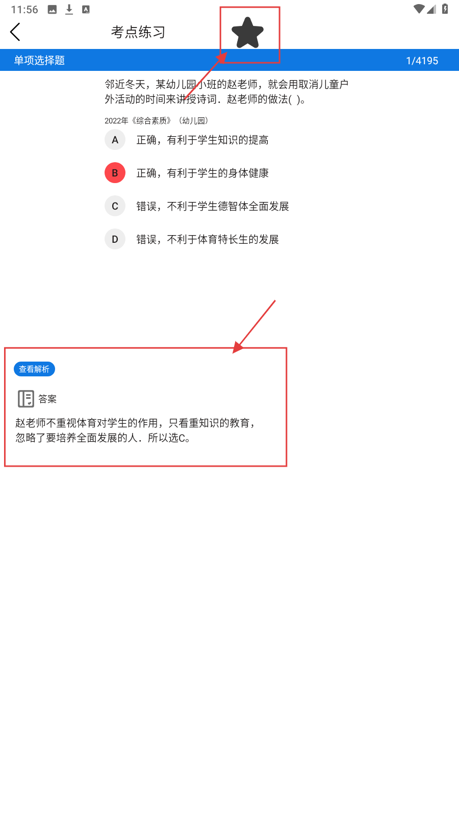 4、完成答题,可查看解析(如赵老师做法不利全面发展),巩固知识要点。