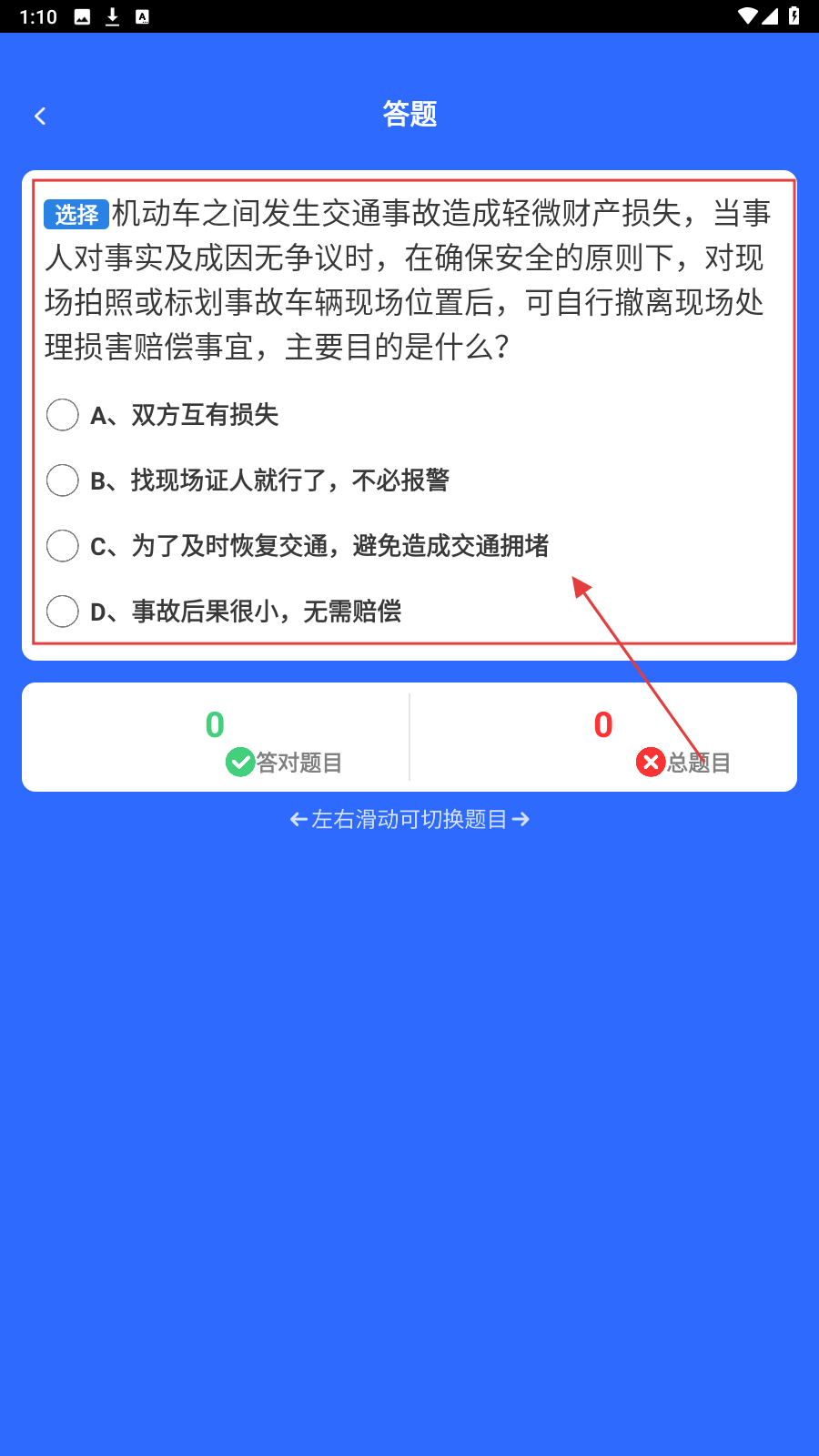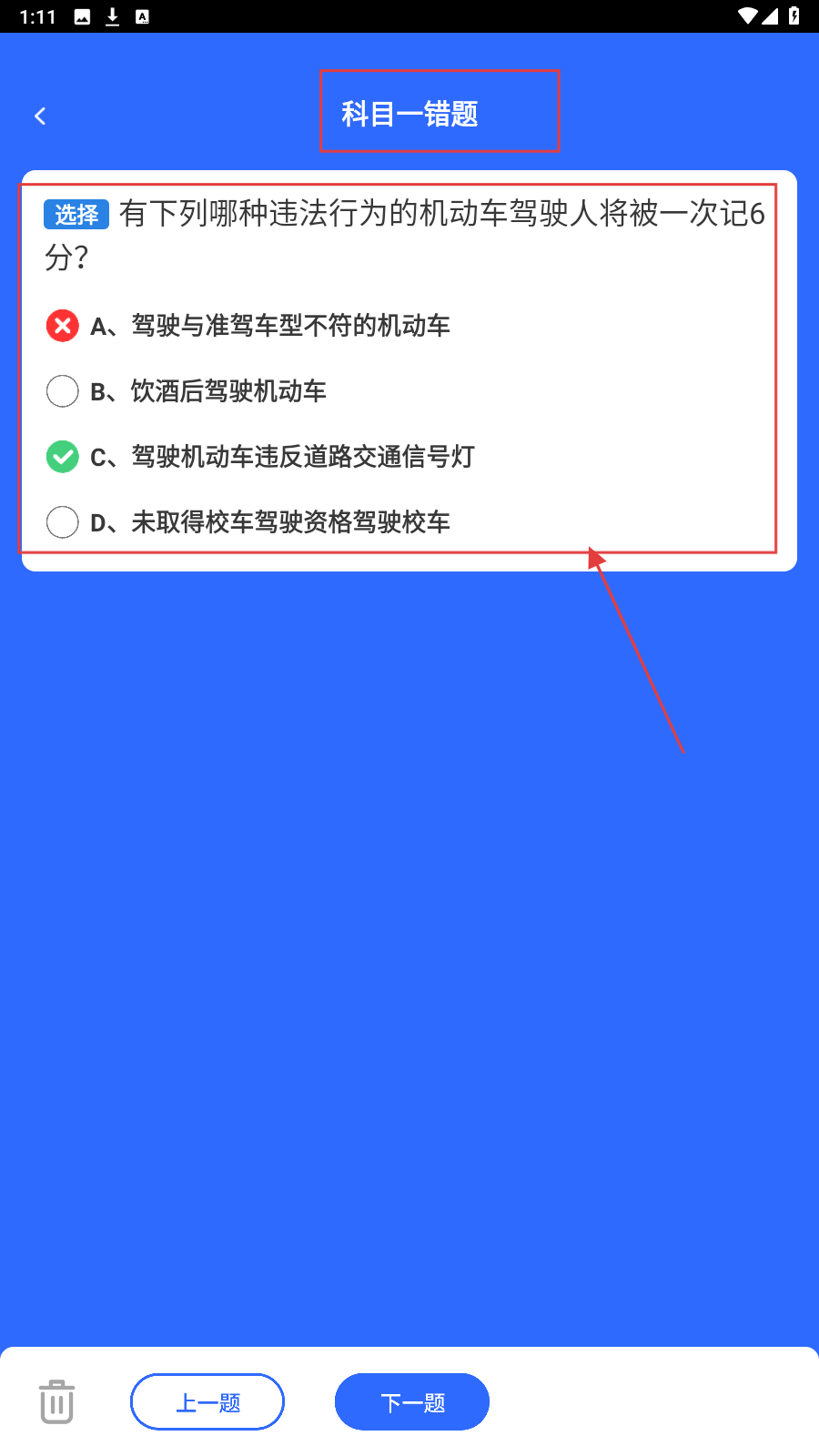 3、在做题页面,查看题目选择答案,如若做错,系统会自动记录错题。