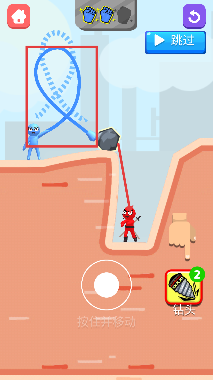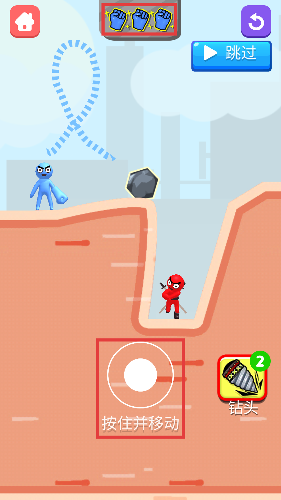 2、战斗时按住屏幕【按住并移动】操控角色,善用上方拳头技能与右侧【钻头-2】道具,规划路径打击敌人。