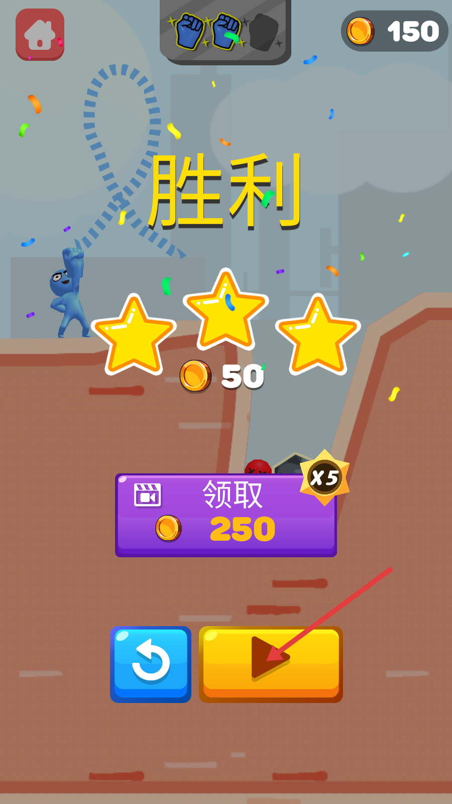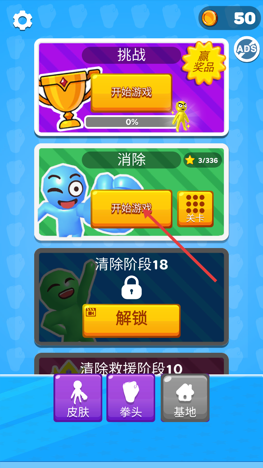 4、通关后点击黄色箭头按钮,继续挑战下一关,领取【50】金币奖励,积累资源解锁更多游戏内容。