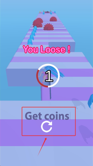 4、继续游戏:如果游戏失败,点击“Get coins”按钮,获取更多游戏币以继续游戏。