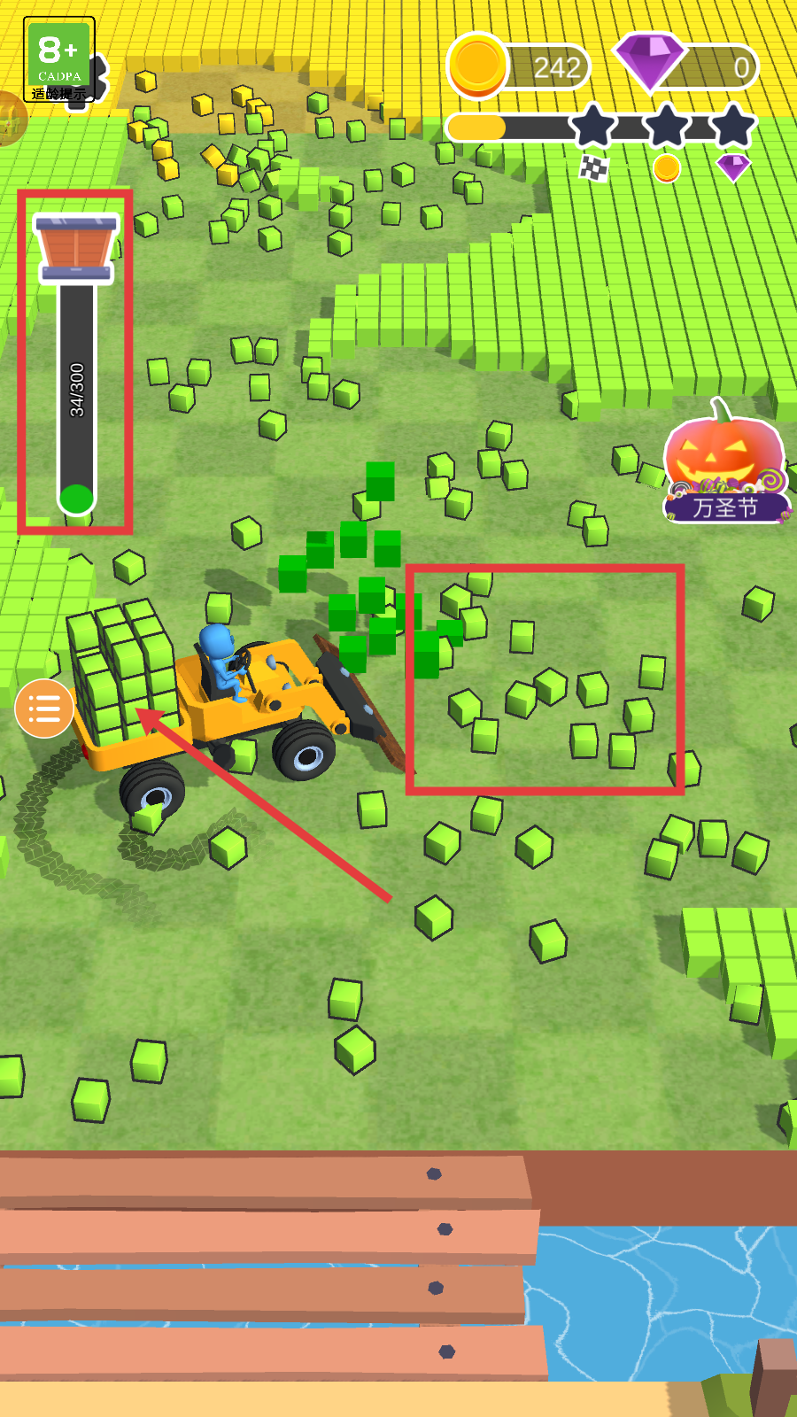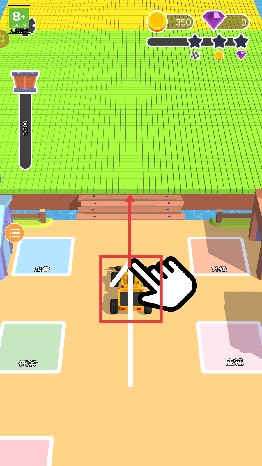 2、操控车辆清理【绿色方块】区域,持续装载提升左侧【34/300】进度,积累资源为后续升级准备。
