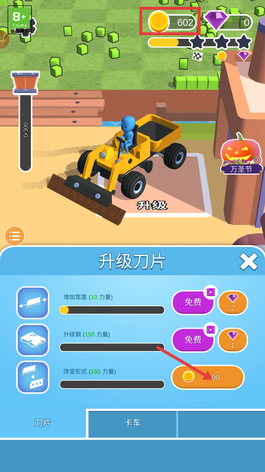 3、攒够金币后优先升级刀片【改变形式】,消耗300金币强化采集效率,助力更快收集资源。