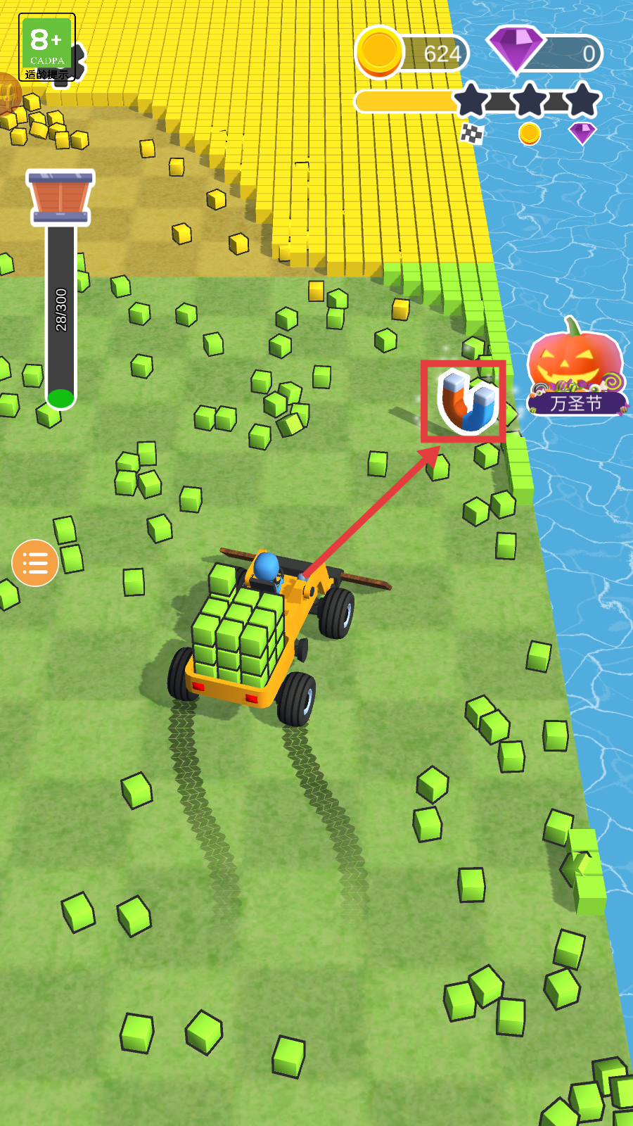 4、留意场景中的【磁铁】道具,靠近拾取后自动吸附散落方块,大幅提升收集速度。