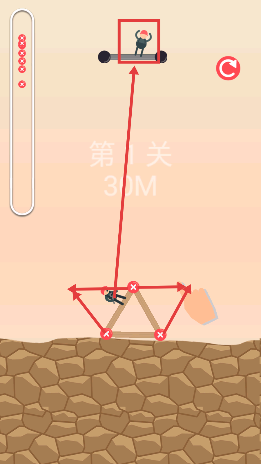 2、第1关需连接底部节点构建支撑,按指引搭建路径,助角色抵达上方平台,完成基础教学。