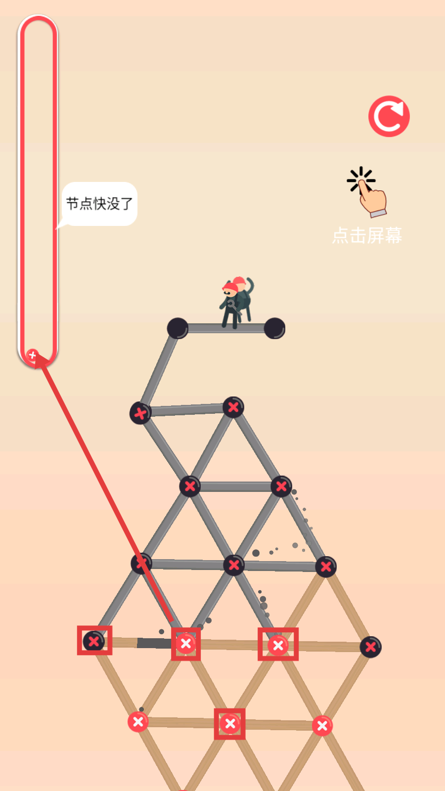 3、留意【节点快没了】提示,点击屏幕补充节点,规划结构避免浪费,保障搭建进度推进。