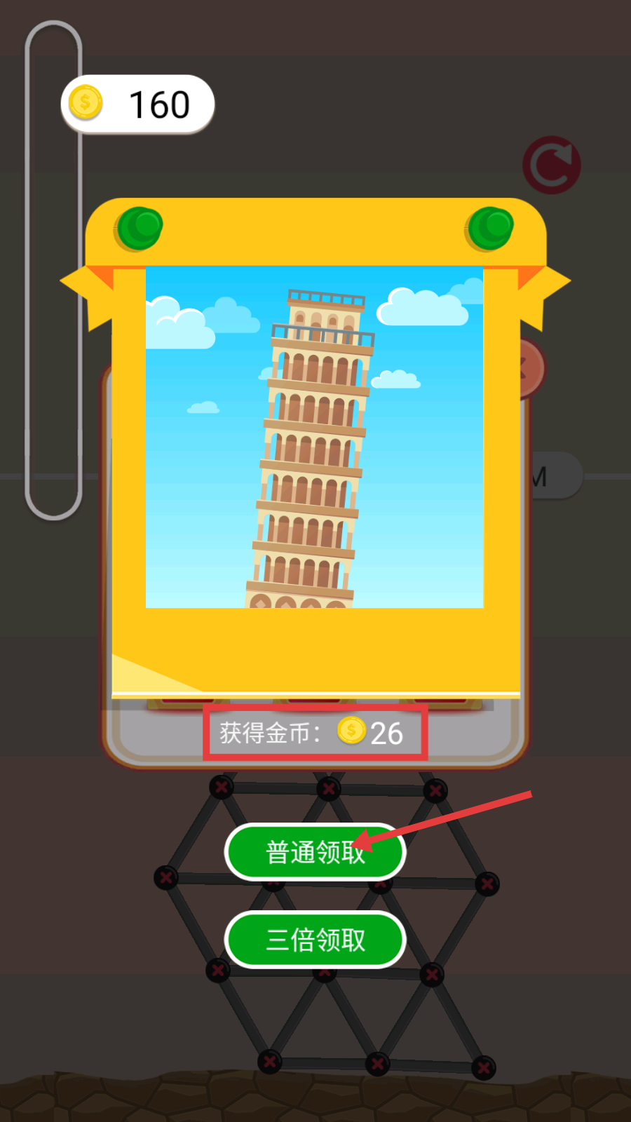 4、通关后优先点击【普通领取】获取26金币,快速积累资源,为后续升级建筑功能准备。