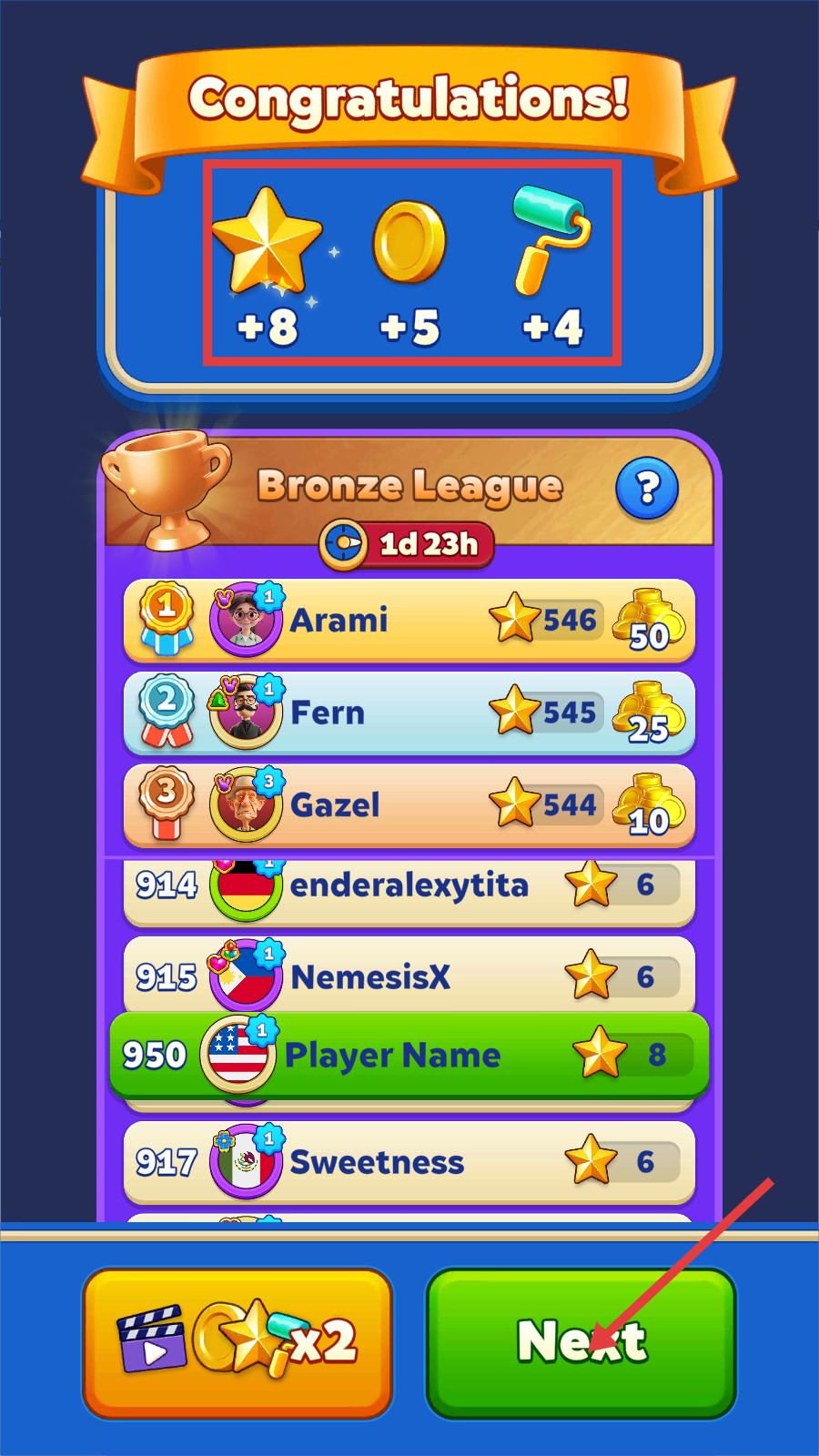 4、结算领取【 8-星星】【 5-金币】【 4-滚筒】,点击【Next】推进,冲击联赛排名。