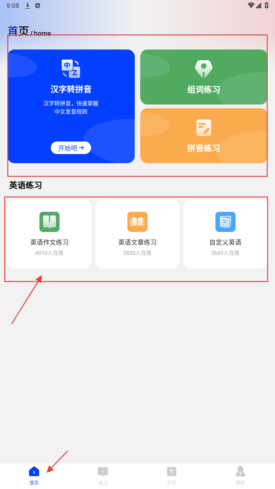 1、打开应用,在【首页】有汉字转拼音、组词练习等功能,选择要进入的功能,如点击【拼音练习】。