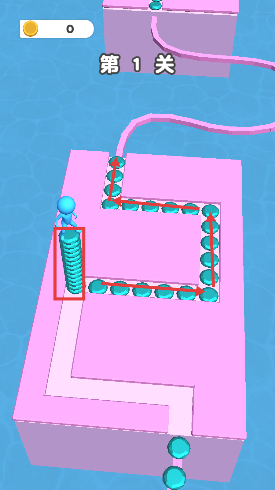 1、第1关点击底部滑动条,驱动蓝色小人推动宝石,沿粉色路径启动收集。