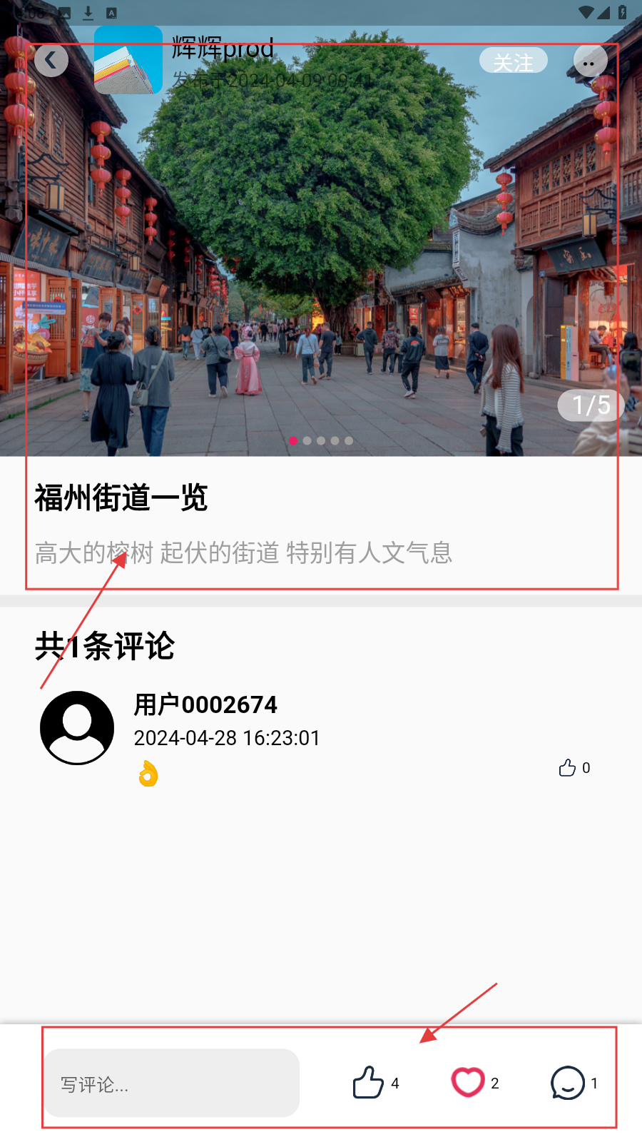 4、遇感兴趣动态(如福州街道),点进入看详情,可点赞、评论互动。