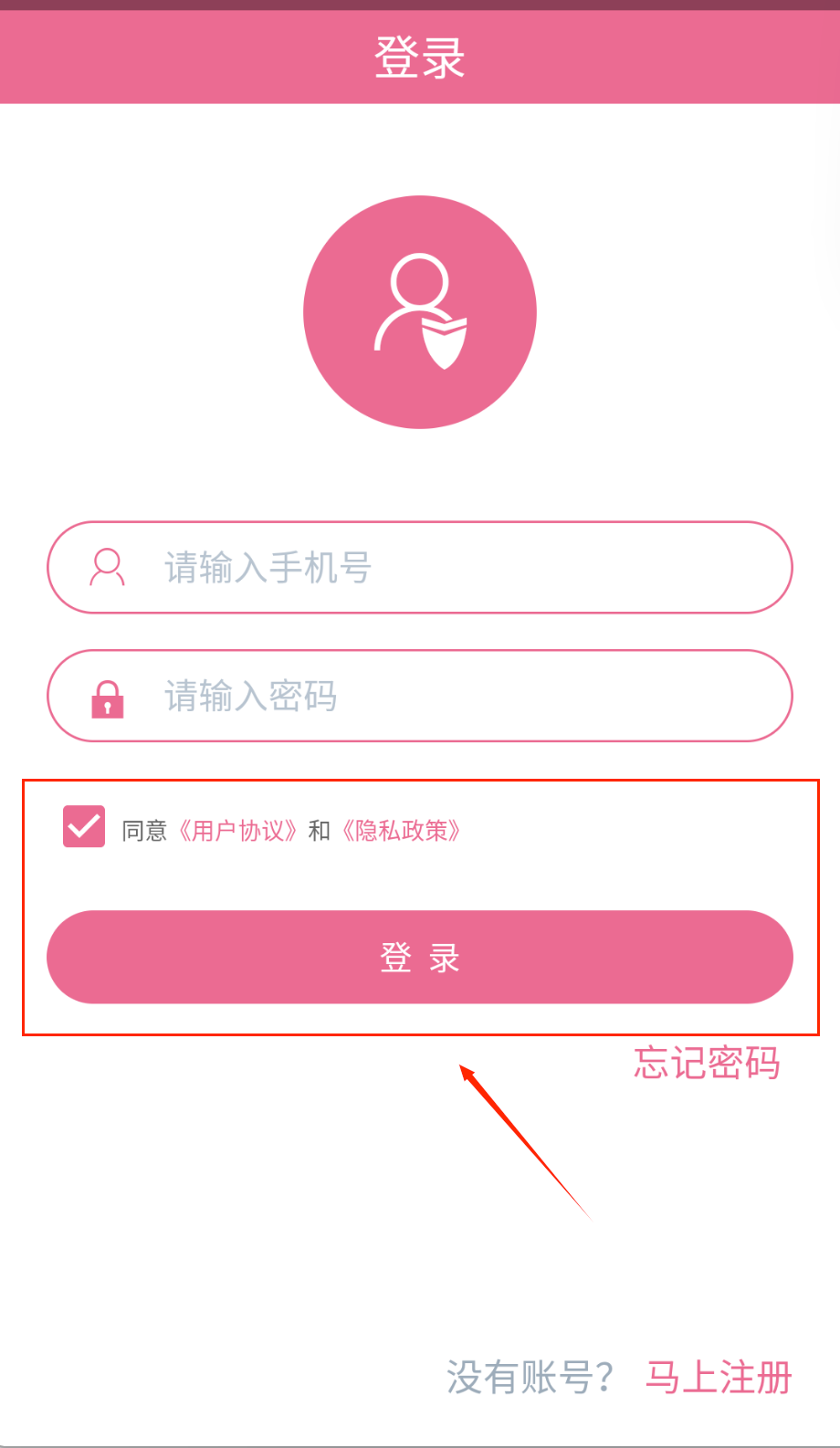 3、登录时先输入手机号和密码呢,记得勾选同意用户协议那个小方框,然后点粉色登录按钮就能进入软件啦。
