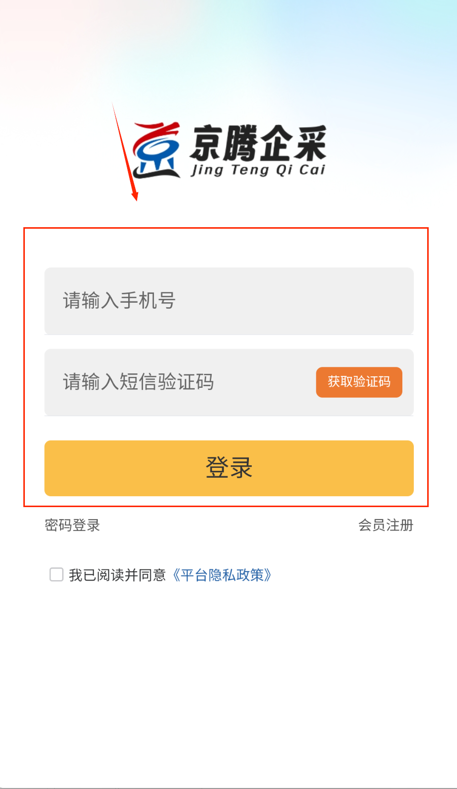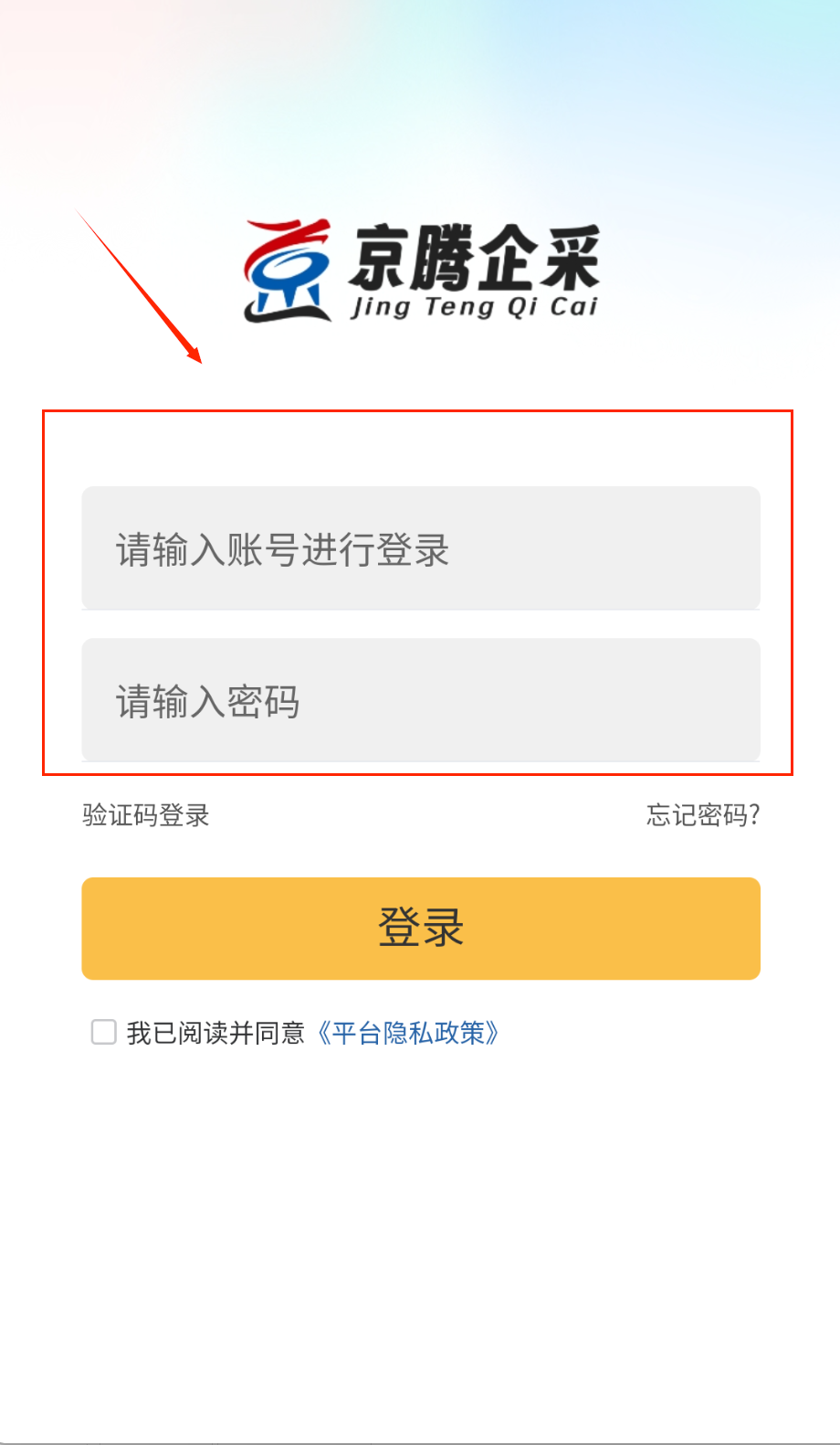 1、打开APP进入登录页,在"请输入账号进行登录"框输入注册手机号或企业账号哦。密码输入需区分大小写呀。