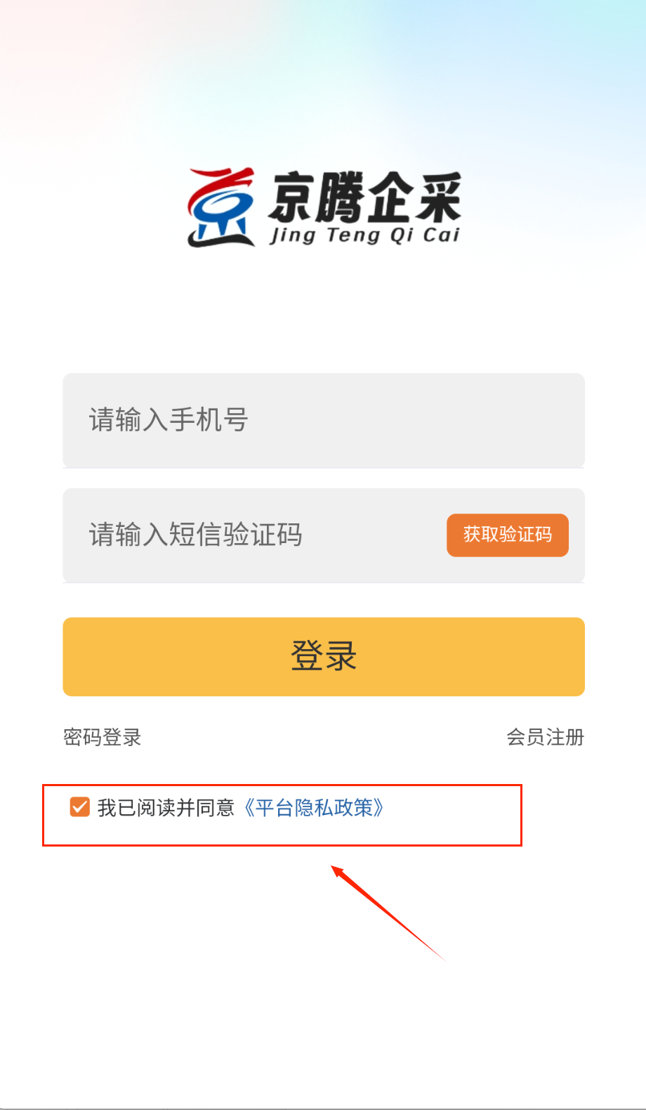 4、首次登录需勾选同意隐私政策,黄色登录按钮会变为可点击状态啦。记住密码功能可勾选方便下次登录哟。