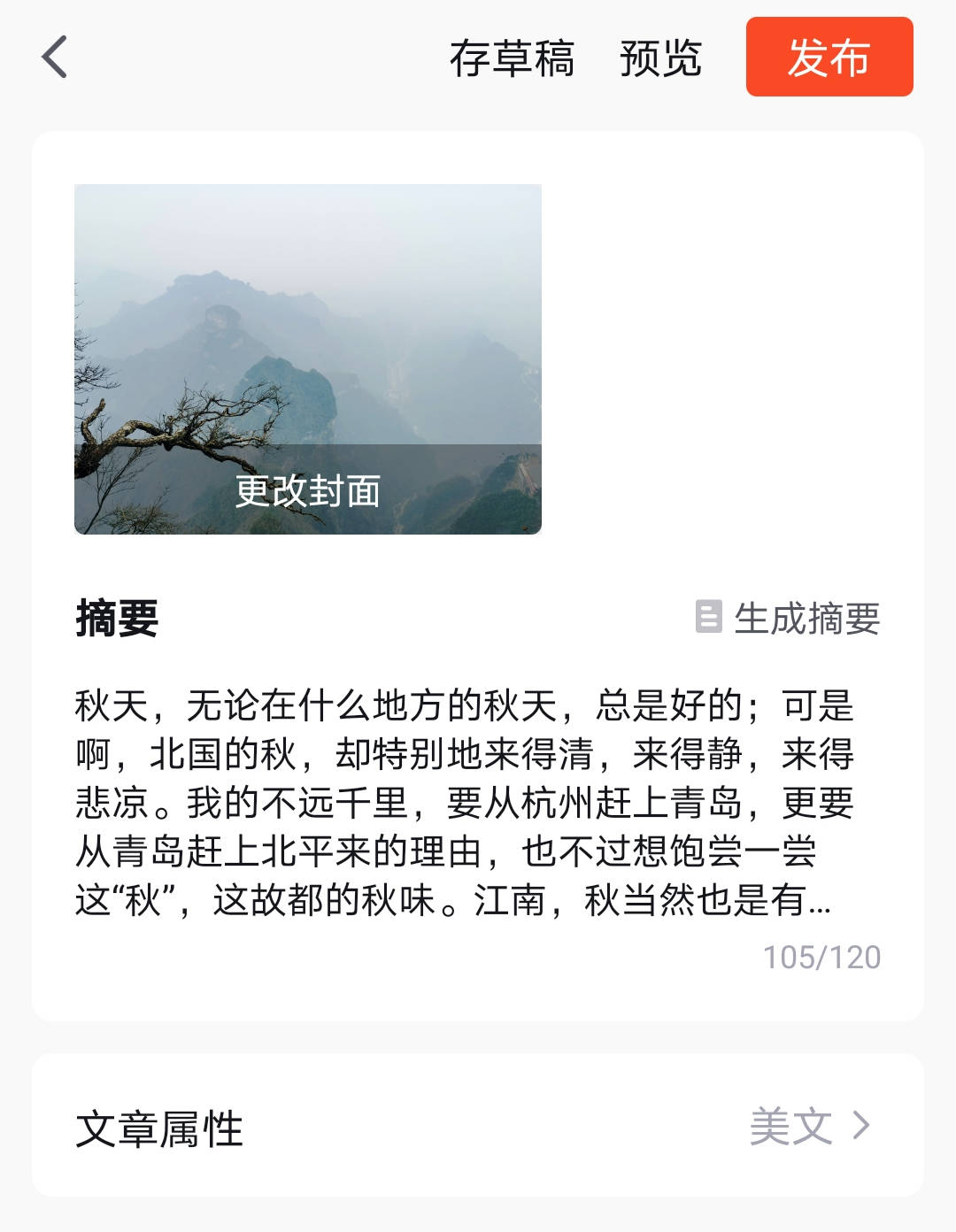 2)编辑完正文后,点击“下一步”,可以上传封面、添加摘要、选择文章属性(如“观点评论”、“消息资讯”、“八卦爆料”等),全部完成后点击“发布”即可提交审核。