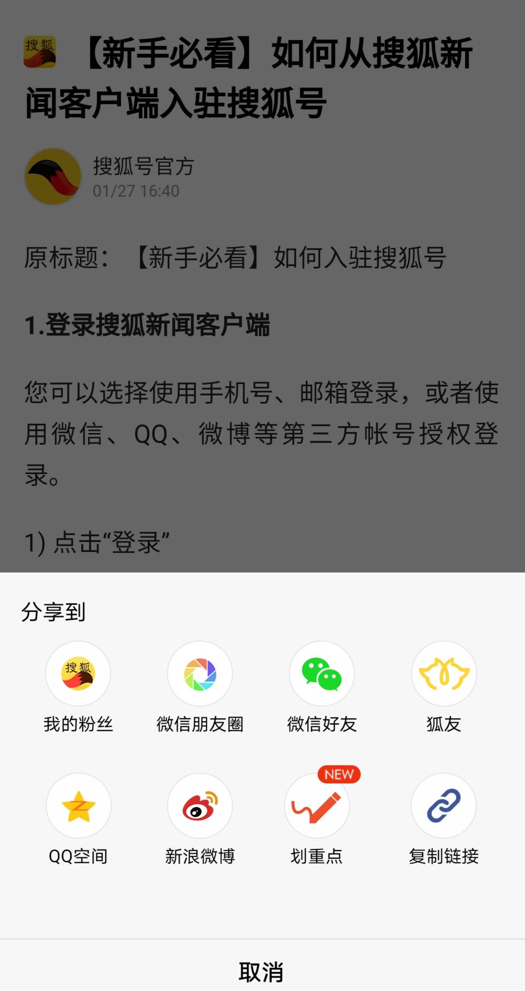1)直接点击文章右下角的“分享”按钮,将文章分享给粉丝、微信好友,或分享至狐友、朋友圈、微博等。