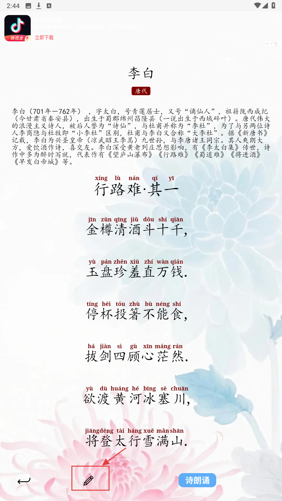 3、阅读诗作时,点击底部铅笔图标,进入生字书写练习环节。