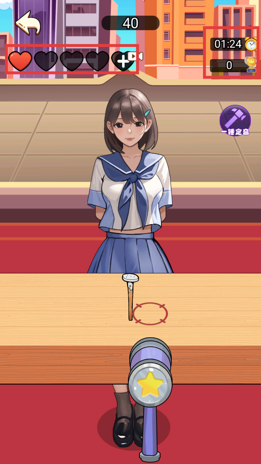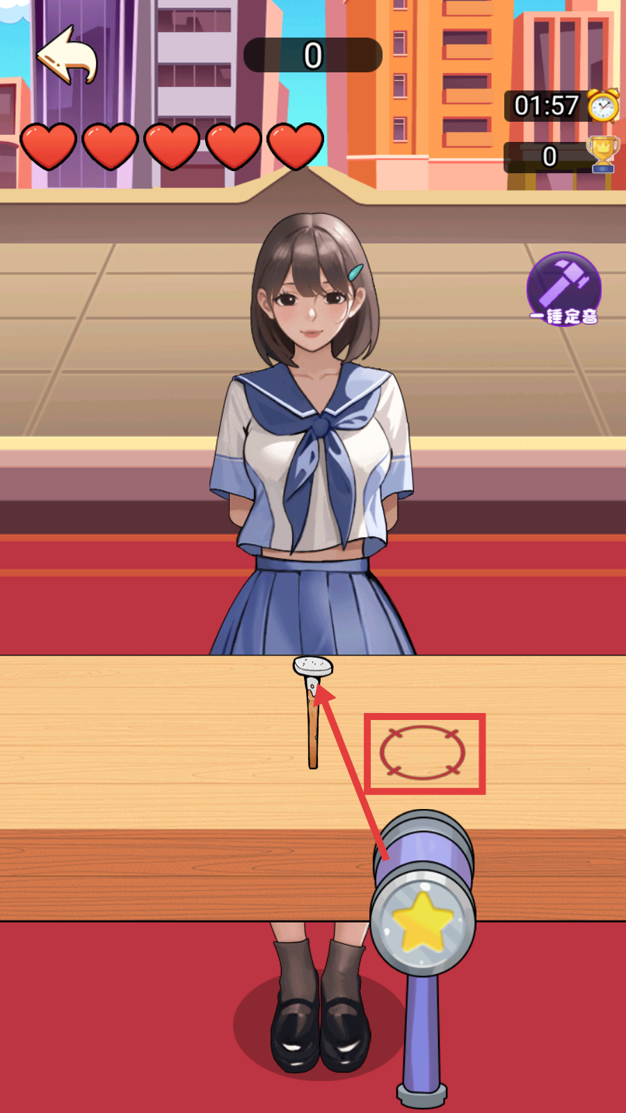 2、挑战中瞄准桌上钉子,点击右侧锤子,对准【红色圆环】区域精准敲击,积累分数。