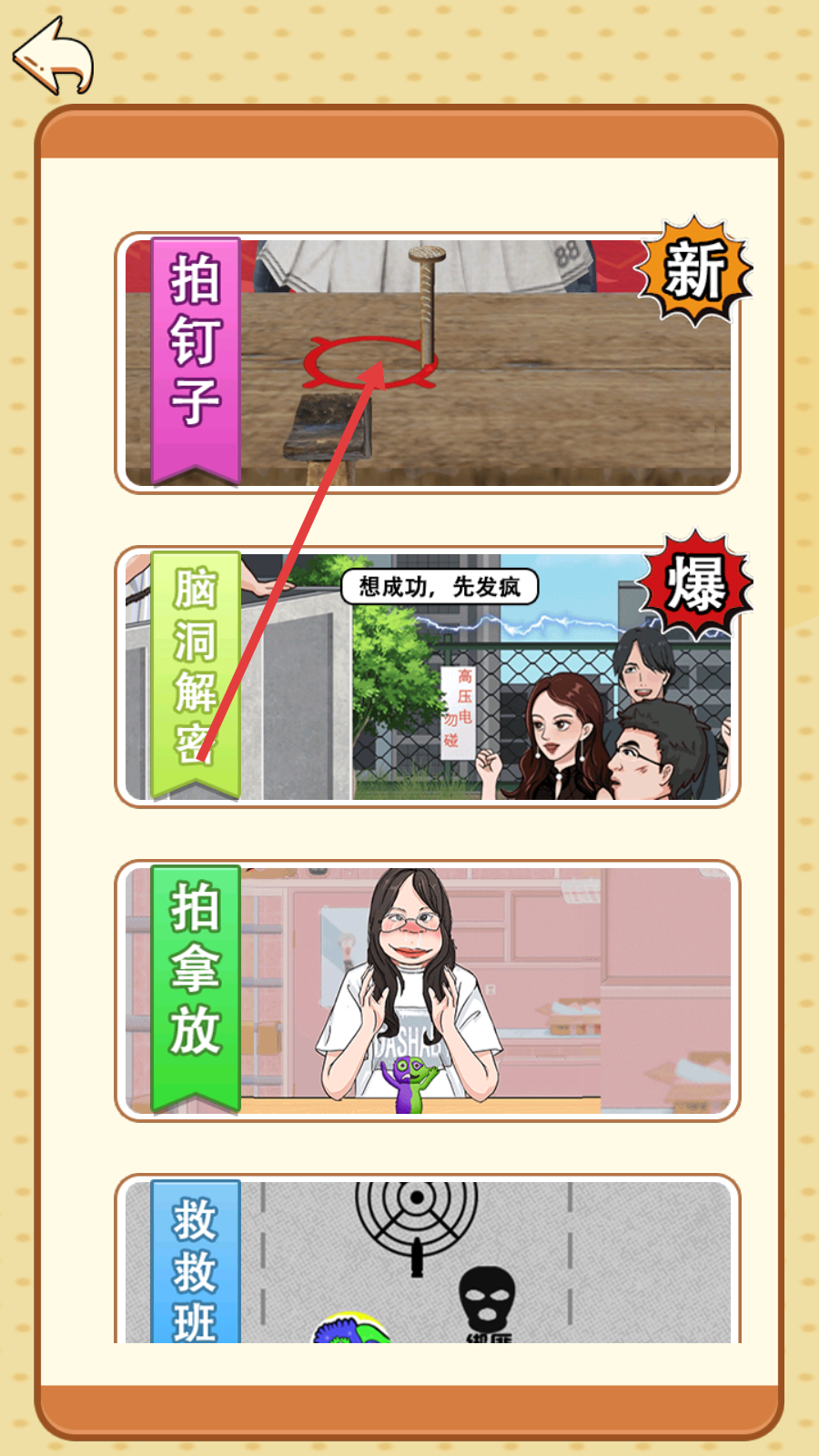 1、主界面选择【拍钉子】新关卡,进入游戏,准备用锤子完成敲击挑战。