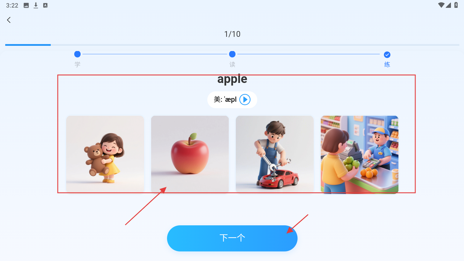 4、到练习阶段,选与【apple】匹配的苹果图片,点击【下一个】学新单词。