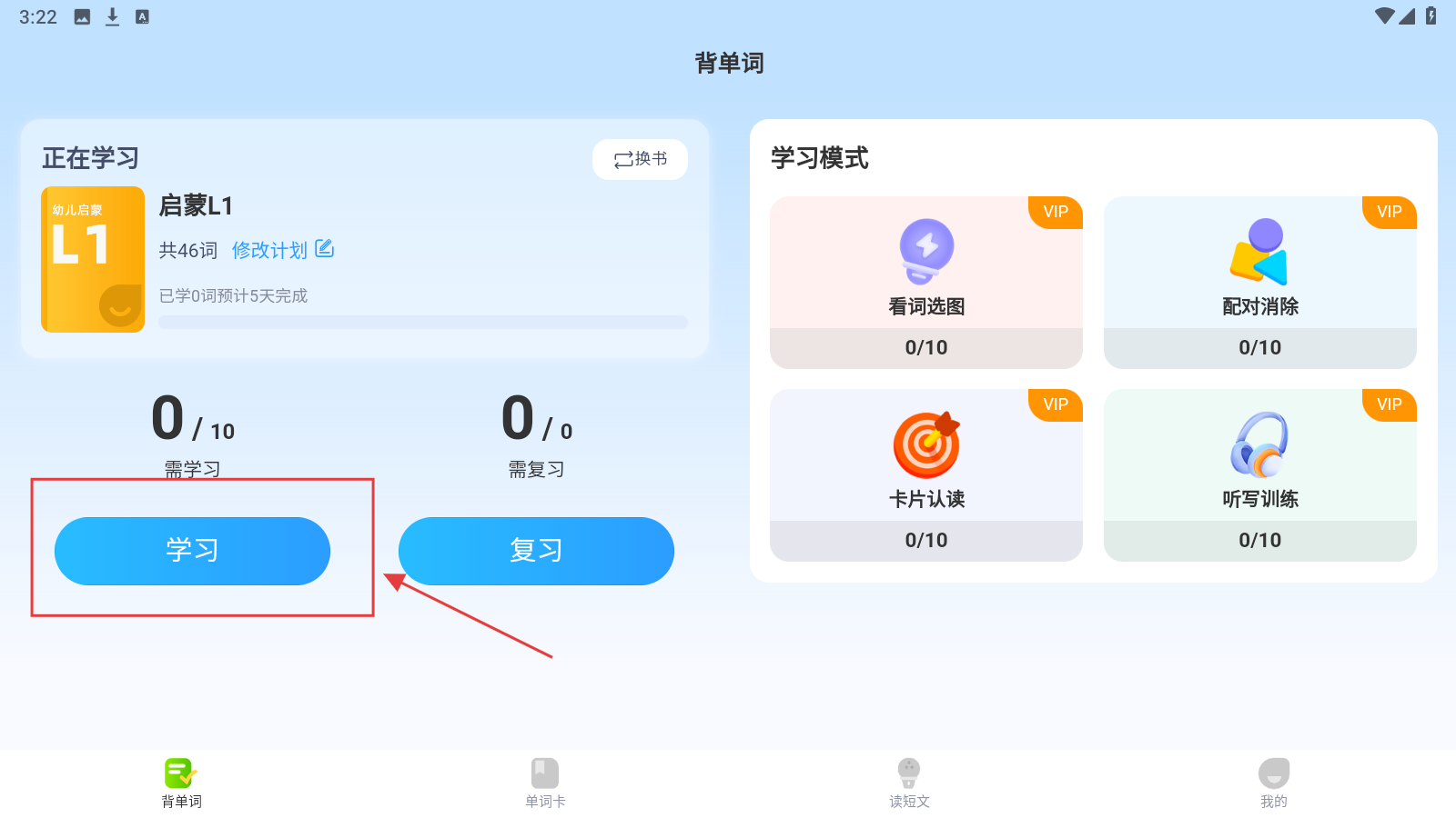1、进入【背单词】页面,点击【学习】按钮,开启【启蒙L1】单词学习。