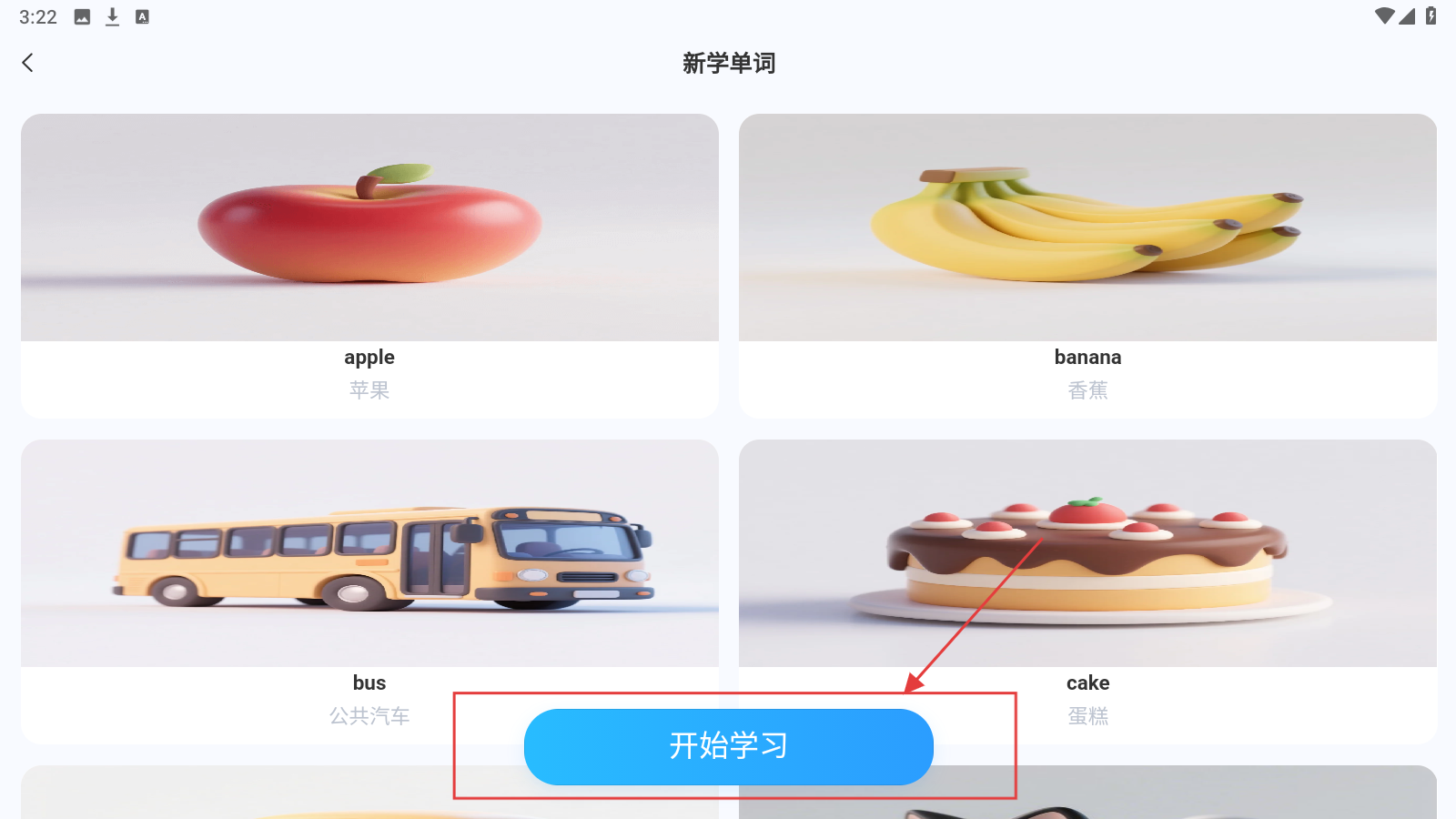 2、在【新学单词】界面,点击【开始学习】,进入单词认知环节。