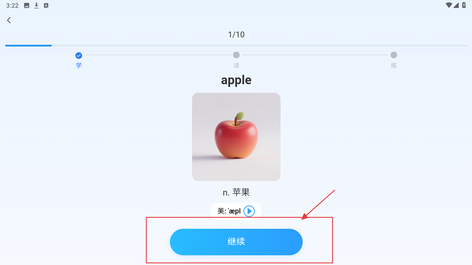 3、学习单词【apple】时,听发音看释义,点击【继续】推进流程。