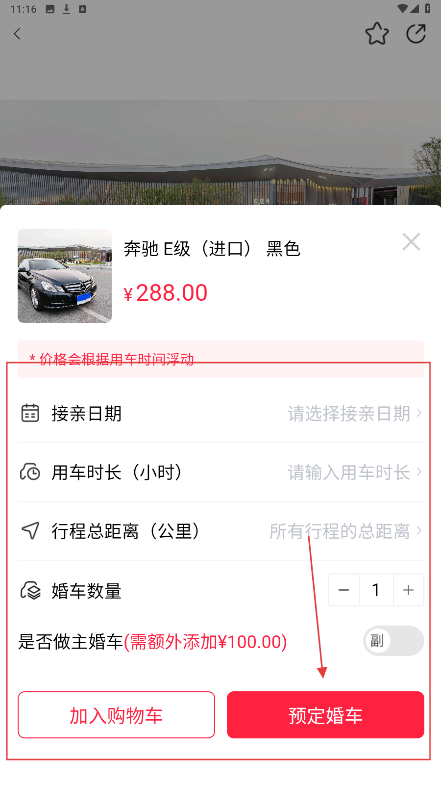 4、在弹窗中填写租车信息,确认无误后点击【预定婚车】即可。