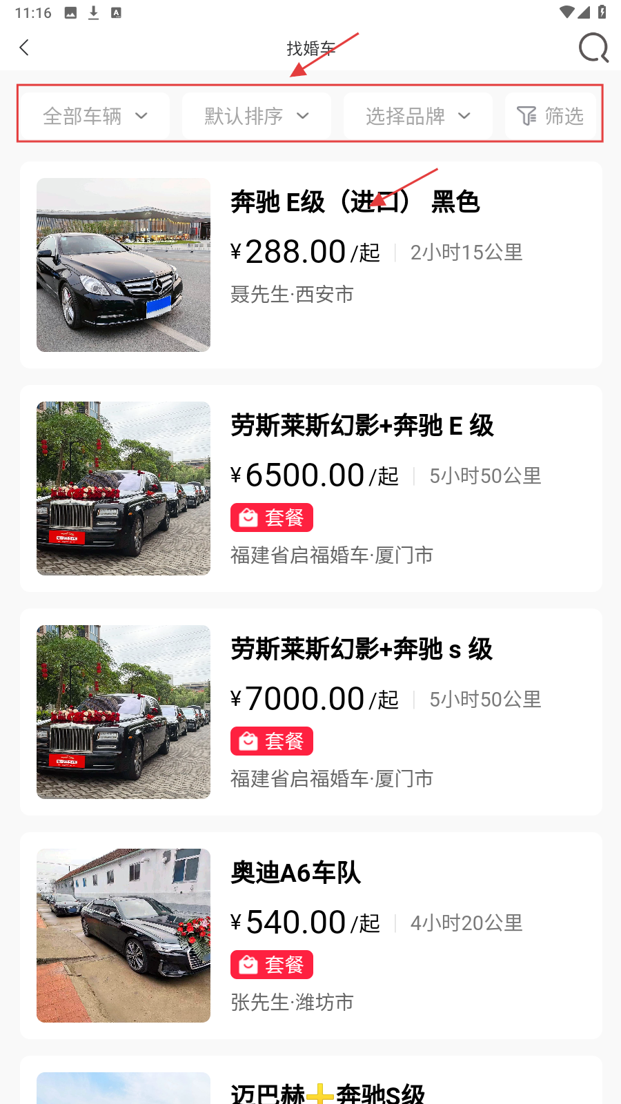 2、进入【找婚车】页面,在上方筛选想租赁的车辆类型,点击心仪车辆进入租车详情页。