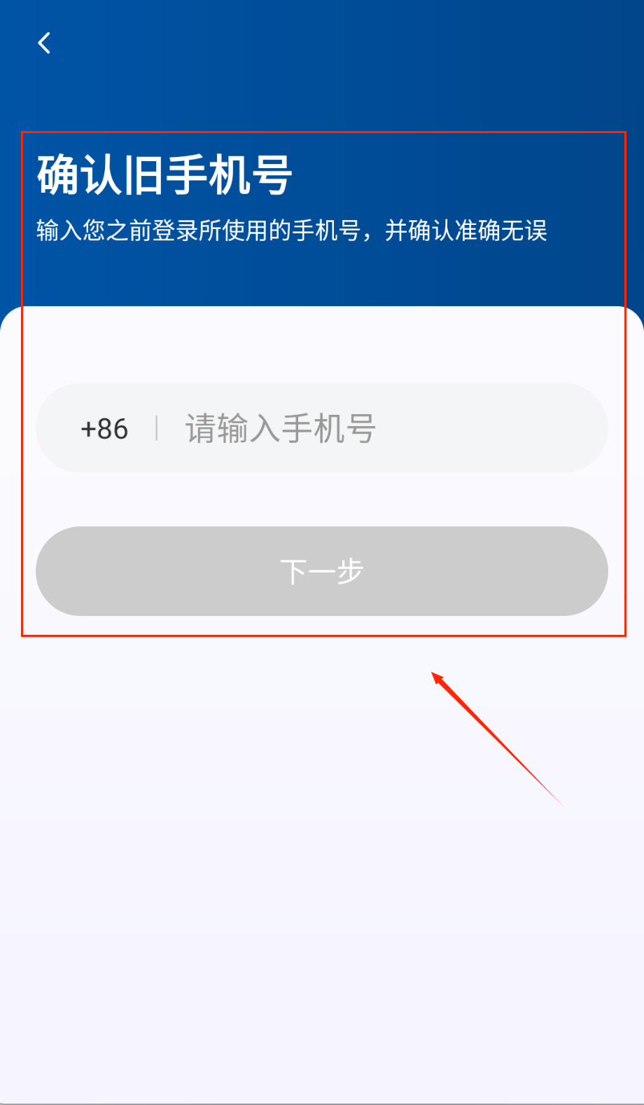 4、更换手机号时要先确认旧号码,在蓝色背景的页面输入原来登录用的手机号,核对无误后点击灰色下一步按钮就可以继续操作啦。