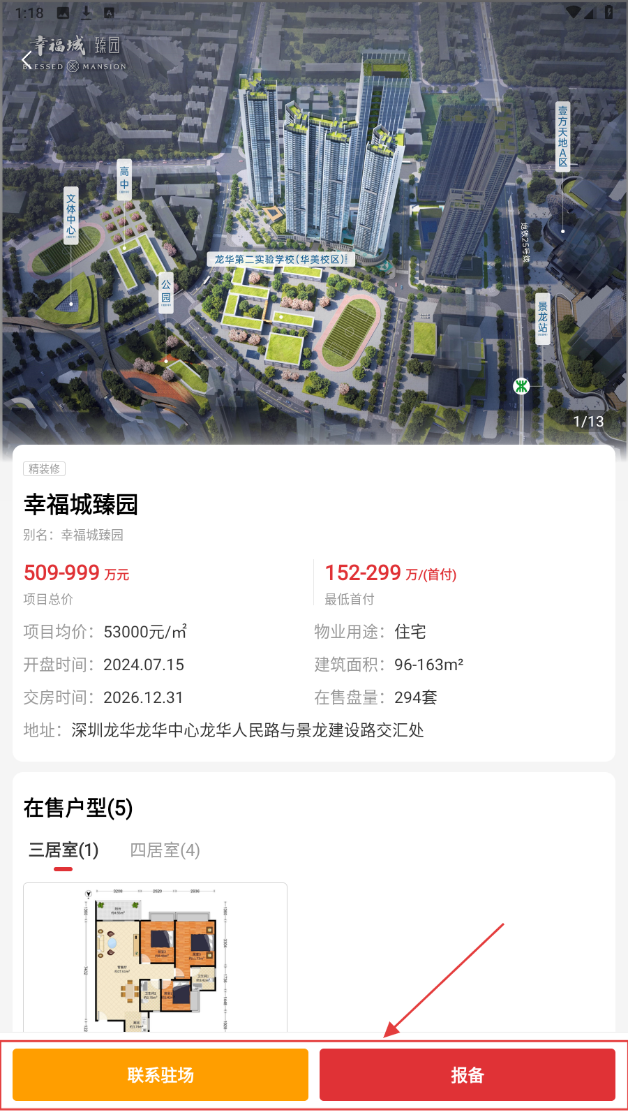 2、点进楼盘详情,查价格、户型等,点【报备】或【联系驻场】对接。
