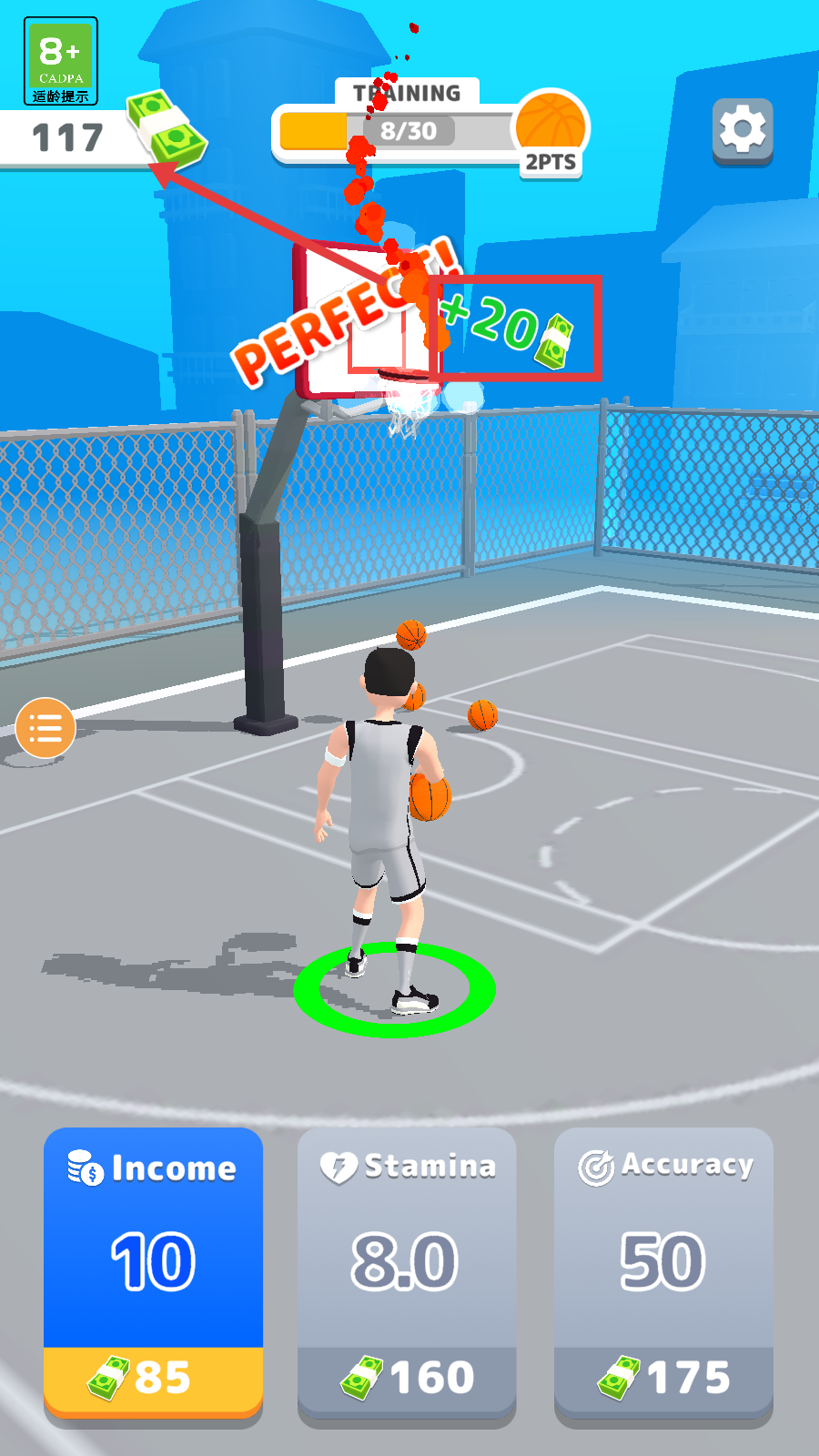 3、精准命中触发【PERFECT!】,额外获取【 20-金币】,通过高评价投篮积累资源。