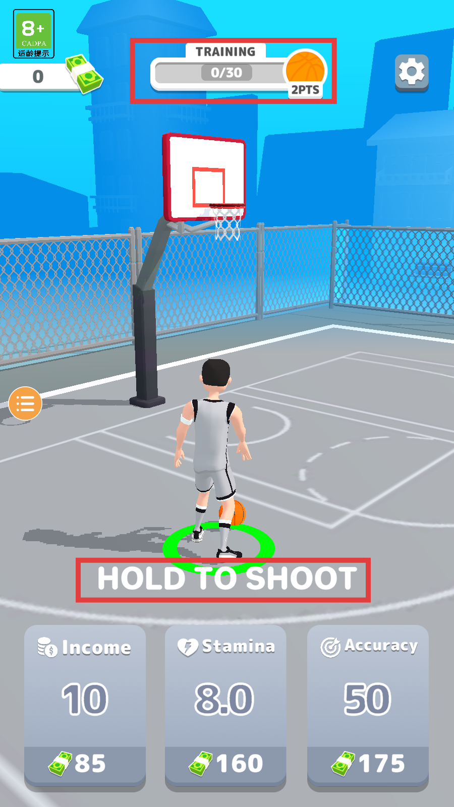 1、进入训练界面,目标【TRAINING-0/30-2PTS】,遵循【HOLD-TO-SHOOT】提示,长按启动投篮练习。